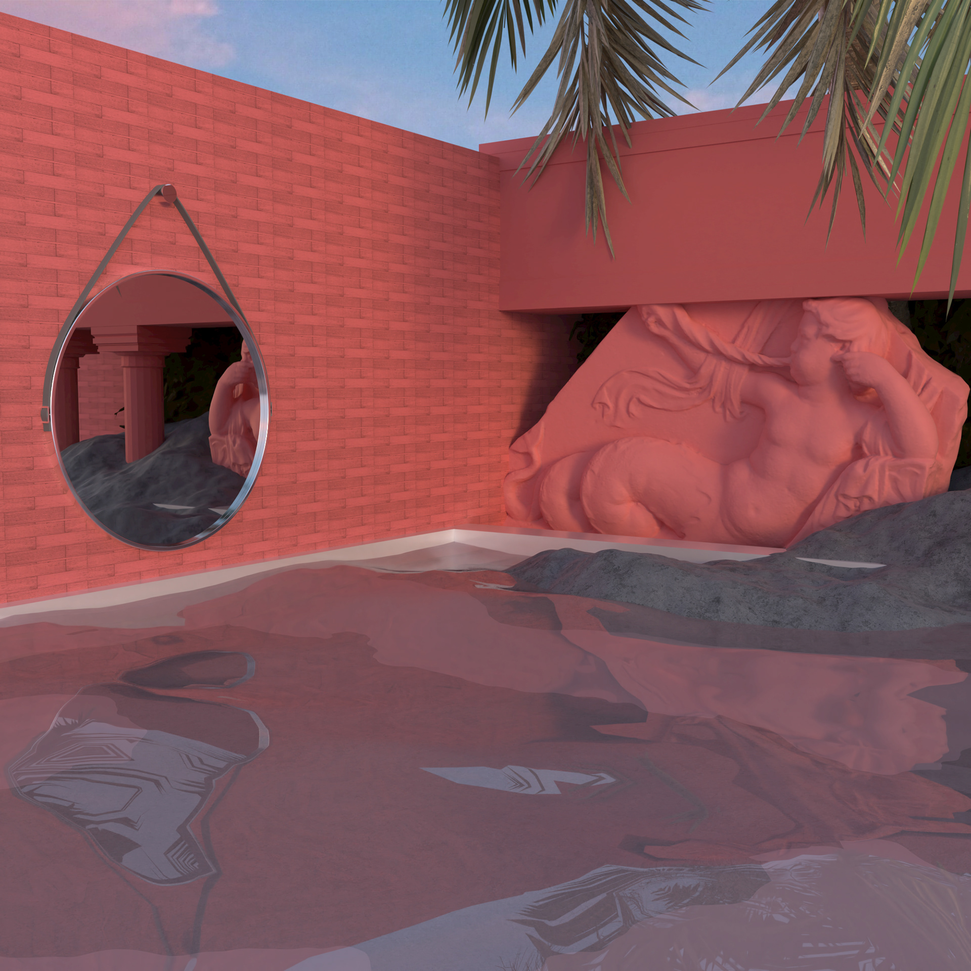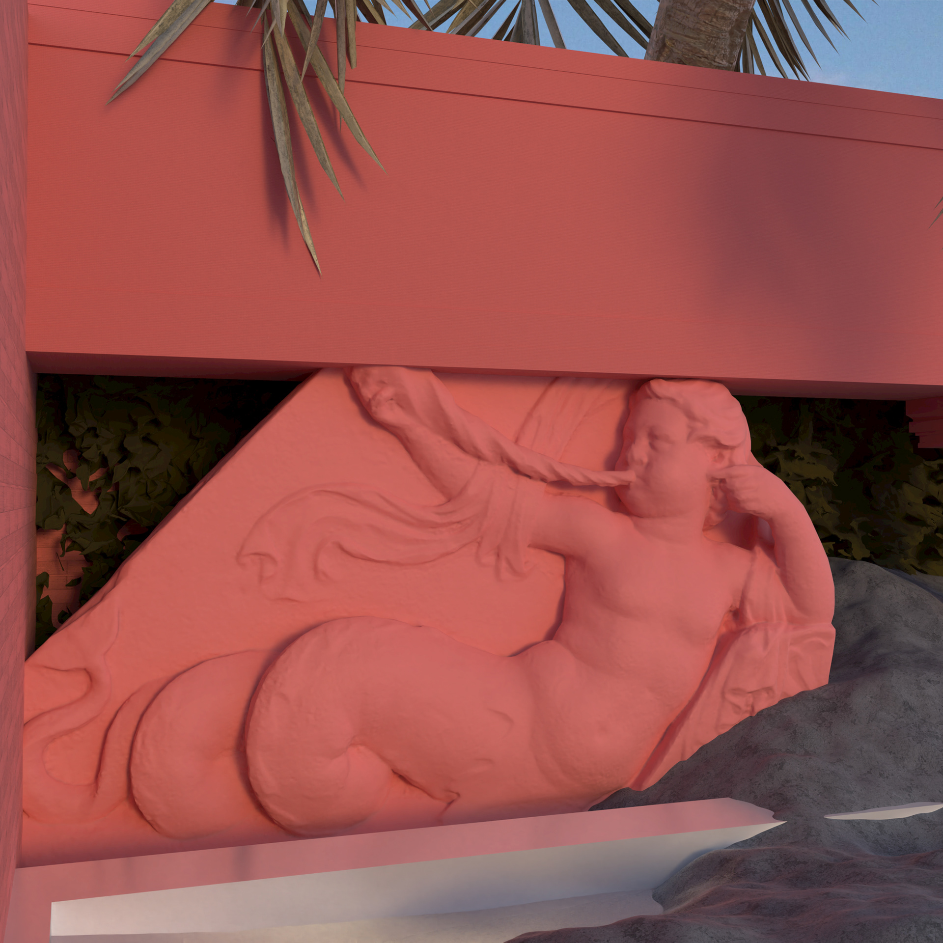 A surrealist exterior design of a contemporary backyard with elements of Ancient Greece. Silver-like pool water and pearl floor. Pinky walls with an ancient greek sculpture of a male siren along with a few wall plants and a backdrop palm tree.